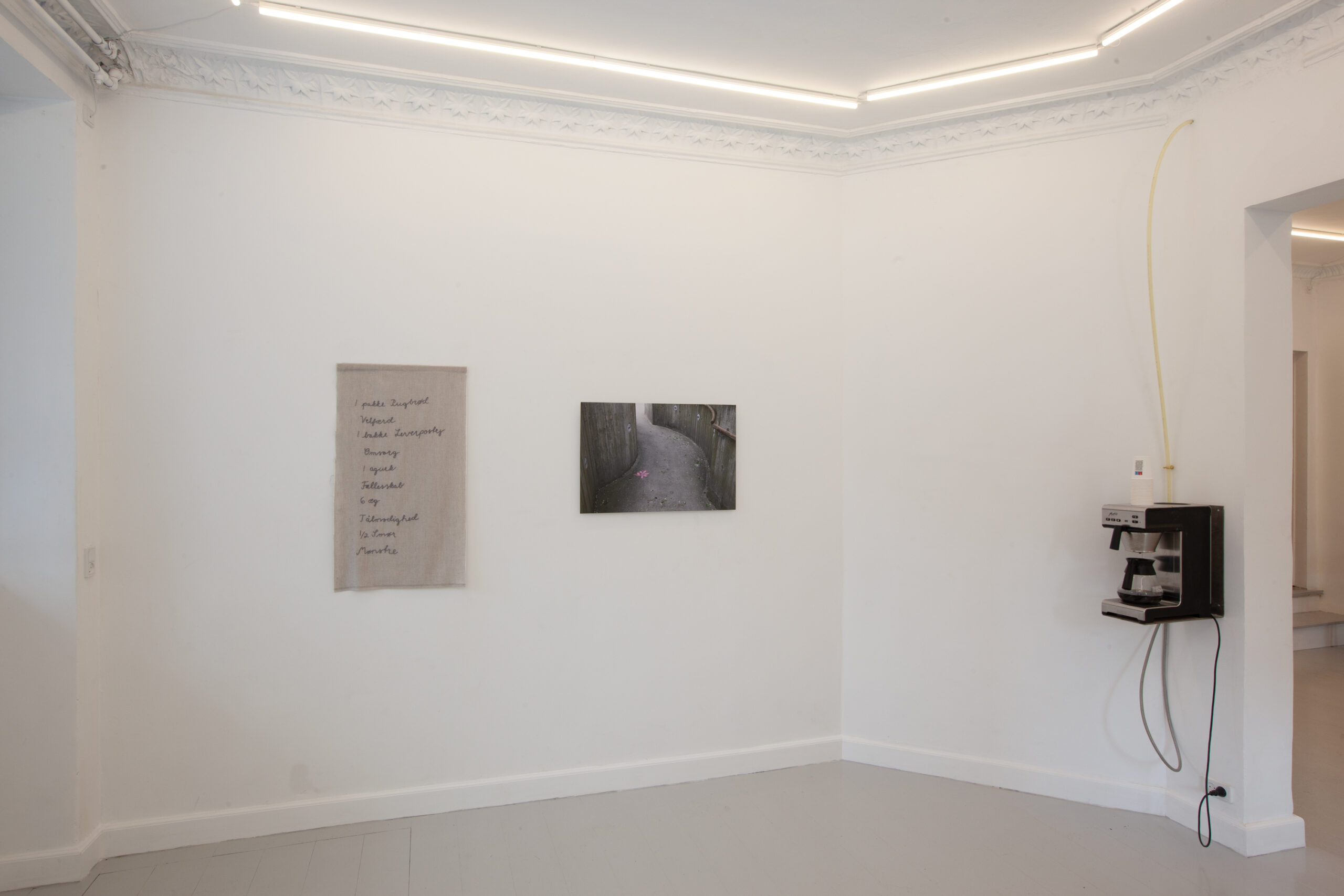 The exhibition ”Patterns for Care” at Bonamatic, follows two tracks, one that unfolds in the intimate domestic space, and one that leads out into the common public space. Maria Finn and landscape architect Jacob Kamp have created works with references to textile patterns by the Danish pioneer in textile printing, Marie Gudme Leth, created in her own studio from the 40’s until the 60’s. In a series of collages Finn combines shoppinglists given to her while working as a home-helper in 90’s, with watercolour renderings of details from Leth’s patterns. Finn and Kamp have created a connection to De Gamles by, a historical and still functioning area with care facilities, where they on site has transferred a detail from one of Leth’s patterns with school chalk. The detail, a leaf, appear in different colours along the buildings to highlight how we construct environments for elderly and vulnerable residents. With a focus on the detail and the microhistory, Finn and Kamp here establishes a situation that connects intimacy and empathy with public space.